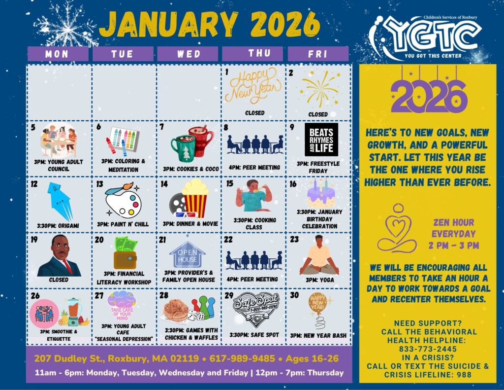 Children’s Services of Roxbury’s You Got This Center is a drop-in center for young adults (ages 16-26) coping with homelessness, mental health needs, addiction, unemployment or other needs, to access jobs, housing, food, and resources, while building a positive community of peers and leadership development skills.